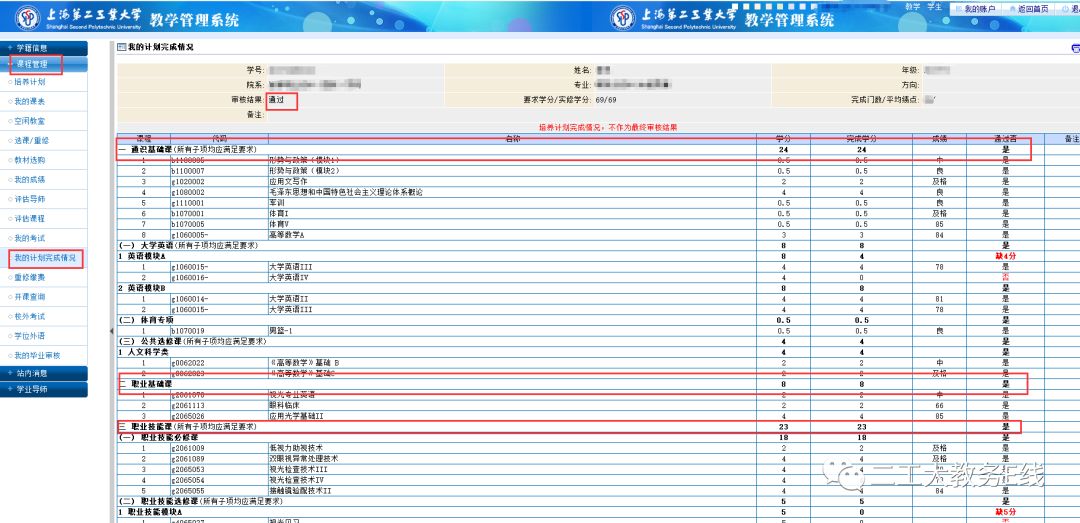 注意:仔细检查每一个大类模块是否通过,如“通识基础课“、”专业基础课”和“专业实践课”,如果其中某个大类未通过,则培养计划完成情况不能审核通过。