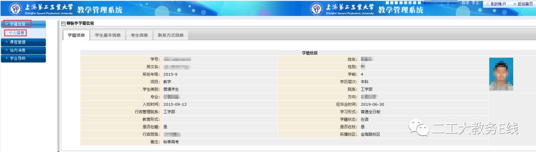 2、点击“学籍管理|个人信息”,核对自己的照片是否正确。