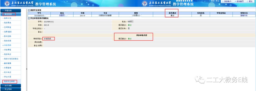 2、点击“课程管理|我的毕业审核”,核对自己的毕业审核情况是否通过。