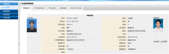 各位2025级新生同学,还可登录教务系统,核查自己录取照片和入学照片以及其它学籍信息是否上传正确。具体操作如下 :