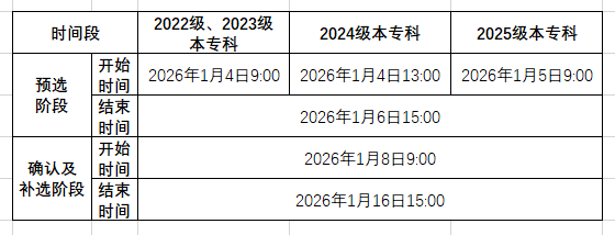 本次选课设预选和确认补选二个阶段。即日起,学生可在“课程管理|开课查询”中查看任务,请提前规划好课表。选课根据学生所在年级分批次进行,2026年1月4日9:00开始,详细安排如下方表格: