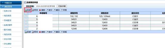 2、点击“新建”按钮,新建选课事务申请。填写正确的课程信息后,点击“提交审核”按钮。